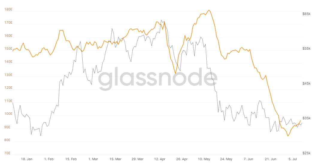 De acuerdo a los datos de Glassnode, se puede evidenciar que el hashrate de Bitcoin se encuentra en un aumento continuo desde principios de Julio, ubicándose actualmente en 96,1 TH/s.