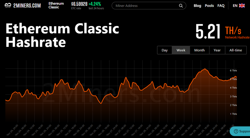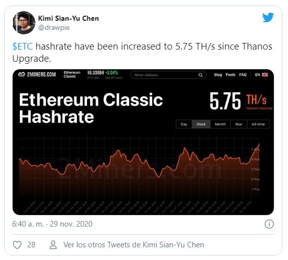 El hashrate de la blockchain Ethereum Classic (ETC) aumentó a 5.21 TH/S luego de la implementación exitosa del hard fork Thanos en las primeras horas del 29 de noviembre.