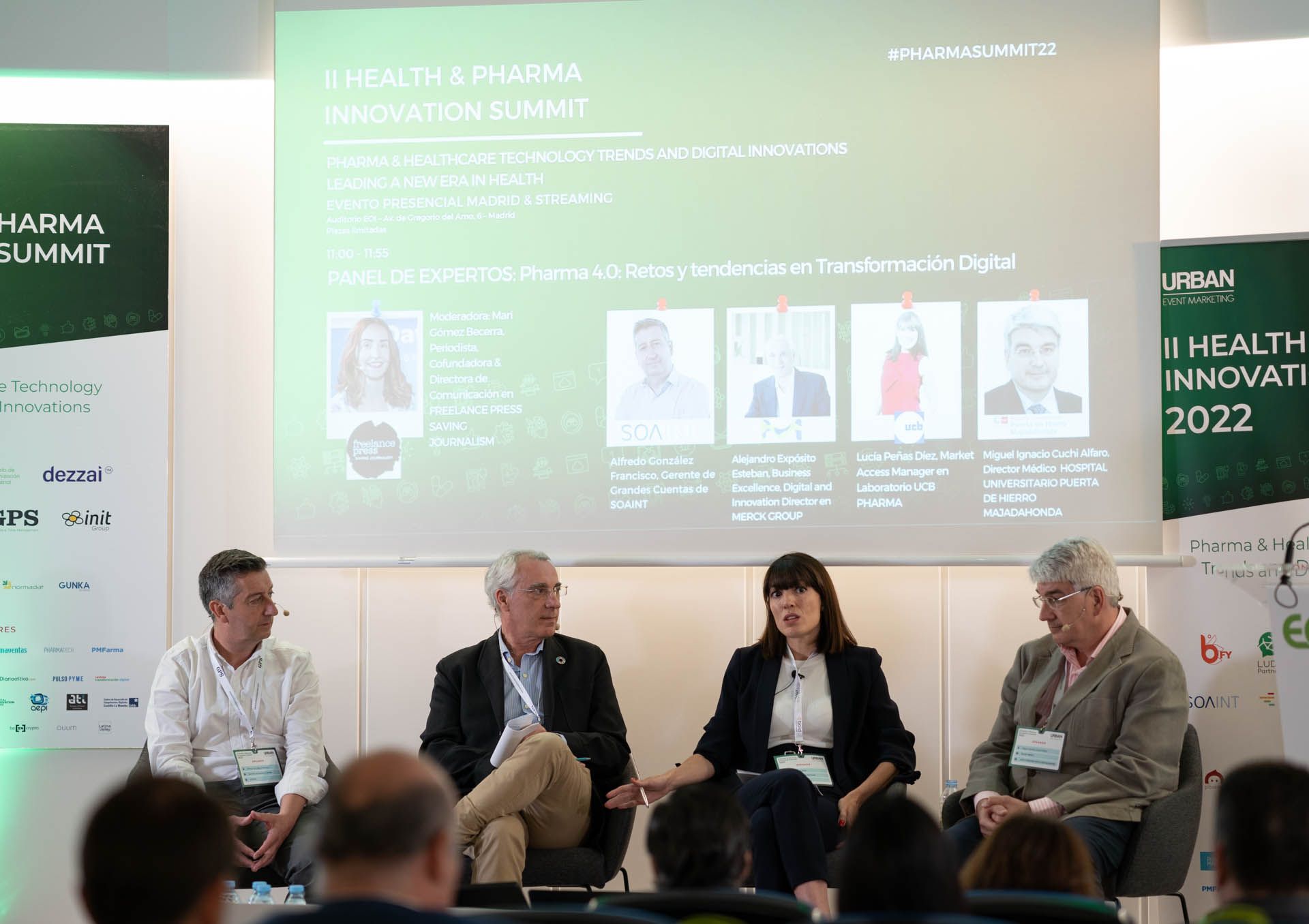 A continuación se realizó el panel de expertos donde se debatió sobre los retos y tendencias en Transformación Digital que contó con la intervención de Lucía Peñas (Market Acces Manager en Laboratorios UCB PAHRMA), Alfredo González (Gerente de Grandes Cuentas de SOAINT), Alejandro Expósito (Buiness Excellence, Digital and Innovation Director en MERCK GROUP) y Miguel Ignacio (Director Médico Hospital Universitario Puerta de Hierro Majadahonda).