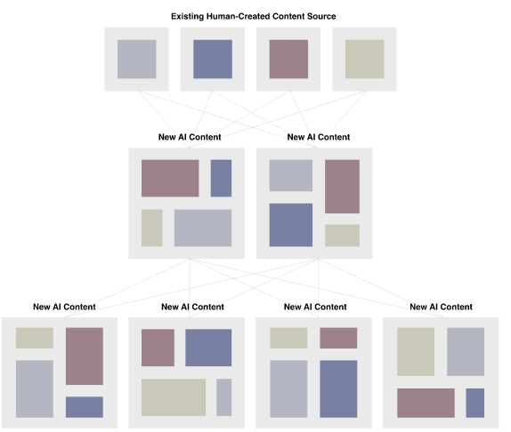 “Un experto estima que el 90 por ciento del contenido en línea podría ser generado por IA para 2025.1 Con el aumento del contenido generado por IA, es importante tener en cuenta que la IA está entrenada en contenido generado por humanos. Si los humanos confían únicamente en la IA para generar contenido en el futuro, cualquier contenido nuevo generado por la IA puede ser contenido reciclado del pasado. Esto podría representar un gran obstáculo para el avance humano. Solo limitando la dependencia de la IA y creando contenido original podemos impulsarnos como especie.”