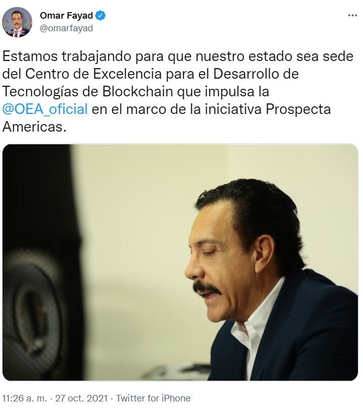 El gobernador de Hidalgo, México, Omar Fayad, anunció que la entidad, en conjunto con la Organización de Estados Americanos (OEA), trabajan para construir el “Centro de Excelencia para el Desarrollo de Tecnologías de Blockchain”, y será una de las 10 sedes que se construirán en América Latina.
