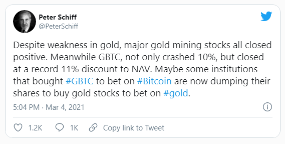 De hecho, a medida que la criptomoneda superior cayó desde su máximo reciente de 58,640.77 dólares, Peter Schiff notó el bajo desempeño de Grayscale Bitcoin Trust.