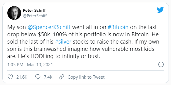 En un tweet publicado el 10 de marzo, Schiff dijo que su hijo, llamado Spencer, “compró la caída”, ya que Bitcoin cayó recientemente por debajo de los 43,000 dólares. El crítico de BTC continuó acusando a su hijo de haber sufrido un “lavado de cerebro”, comparándolo con otros “niños vulnerables” que podrían estar “HODLing hasta el infinito o reventar”.