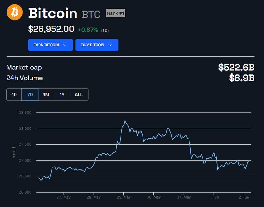 El precio de BTC ha subido marginalmente, pero los mercados de criptomonedas todavía se mueven lateralmente. El activo cotizaba a 26,952 dólares en el momento de escribir este artículo, subiendo desde un mínimo intradía en 26,715 dólares.