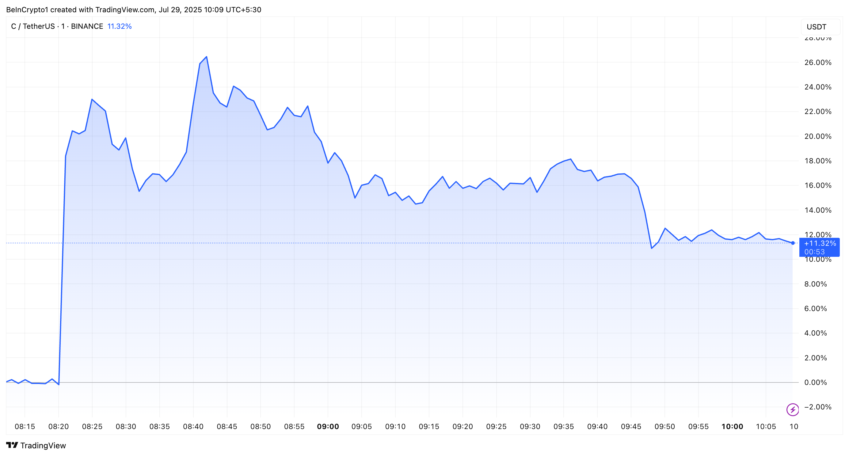 Tras esta noticia, el precio aumentó rápidamente aproximadamente un 26.03%, subiendo de 0.365 dólares a 0.465 dólares. Según la última actualización, la altcoin se negociaba a 0.404 dólares, reflejando una ganancia del 11.3%.