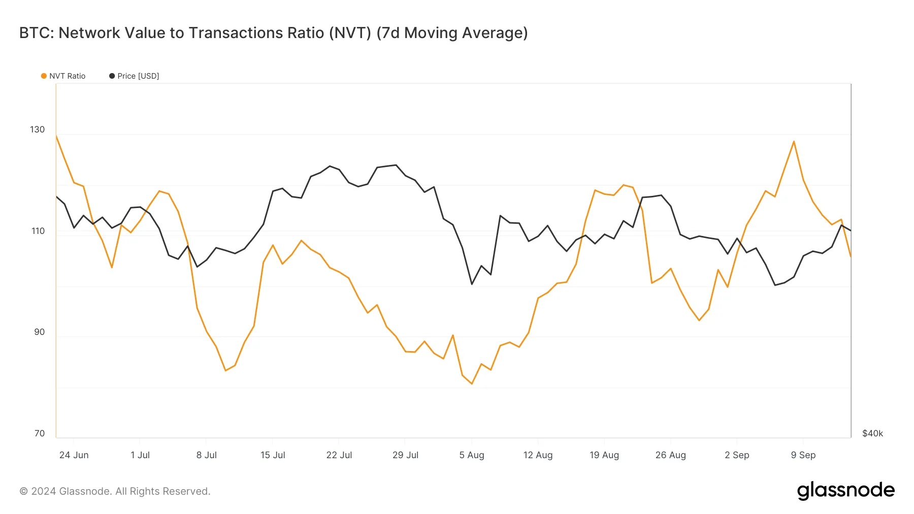 Si BTC convierte este nivel en soporte, podría llevar a mayores ganancias de precio y aumentar el sentimiento alcista entre los inversores. La caída del NVT a corto plazo indica que la actividad de la red puede estar alineándose mejor con la valoración de Bitcoin, apuntando a un aumento de precio más saludable.