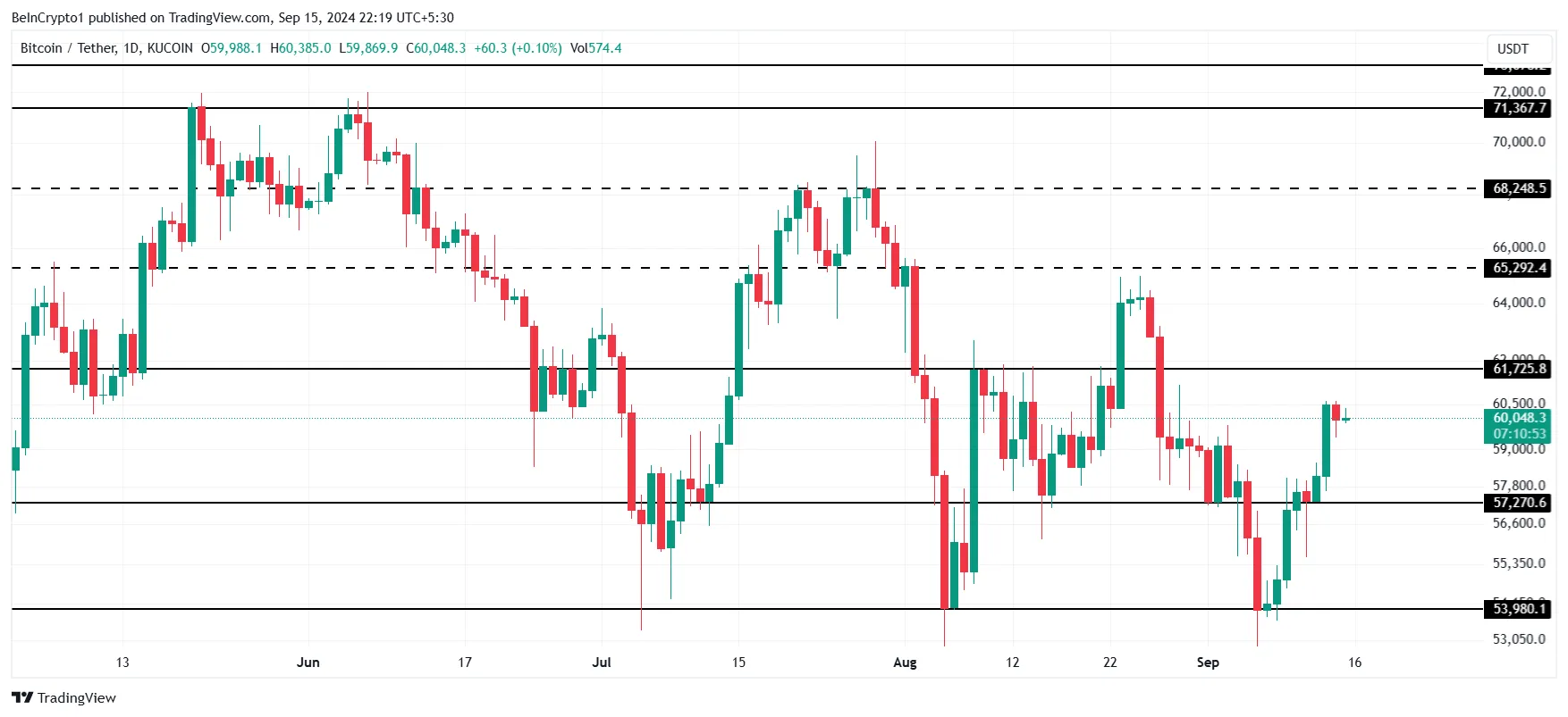 Actualmente negociándose a 60,048 dólares, BTC apunta a la resistencia crítica en 61,725 dólares. Romper este nivel será esencial para sostener su impulso ascendente, y los inversores están monitoreando de cerca el próximo movimiento de precio de Bitcoin.