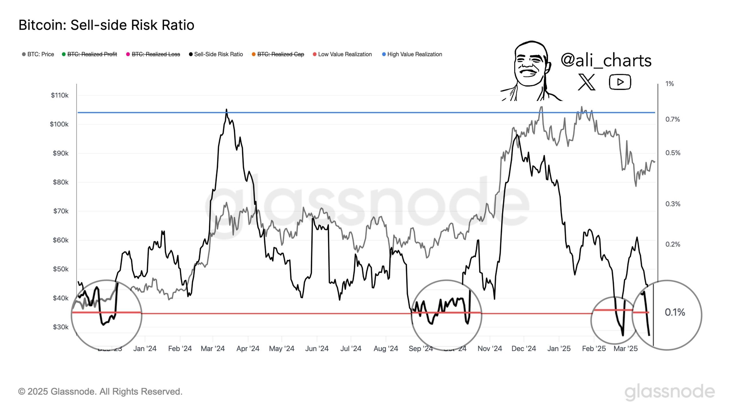Al mismo tiempo, el analista Ali destacó otro indicador alcista: el Sell-side Risk Ratio de Bitcoin había caído a 0.086%.