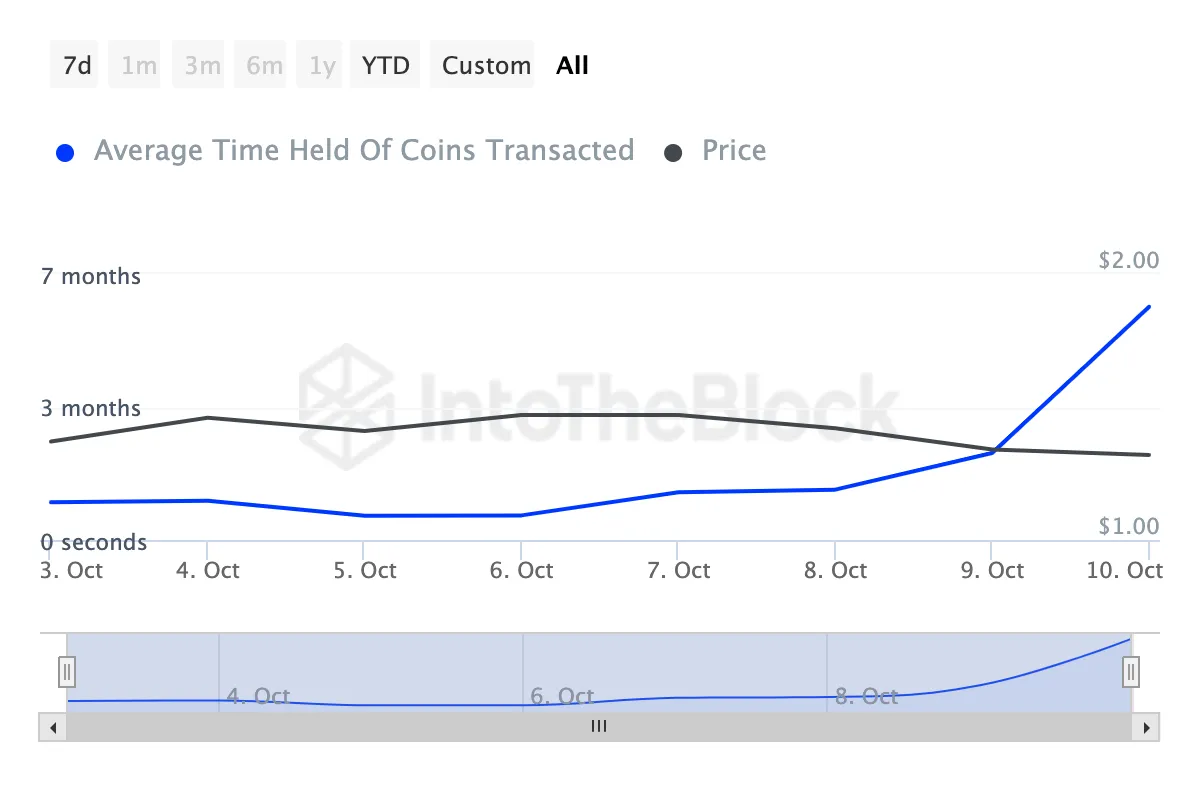 En marzo, FET alcanzó un nuevo máximo histórico de 3.47 dólares. Esto fue antes de la fusión de ASI, que vio al token unirse con SingularityNET (AGIX) y Ocean Protocol (OCEAN). Sin embargo, el precio de FET actualmente está 60% por debajo de ese pico. Aún así, el Tiempo de Retención de Monedas revela que los holders se abstuvieron de vender.