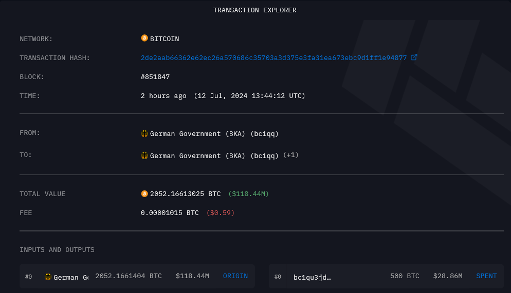 Recientemente, el Gobierno alemán recibió de vuelta 4,169 BTC (equivalentes a 239.62 millones de dólares) desde direcciones de exchanges como Kraken, Bitstamp y Coinbase, junto con otros 500 BTC esta mañana, lo que indica que estos probablemente fracasaron en su intento de venta.
