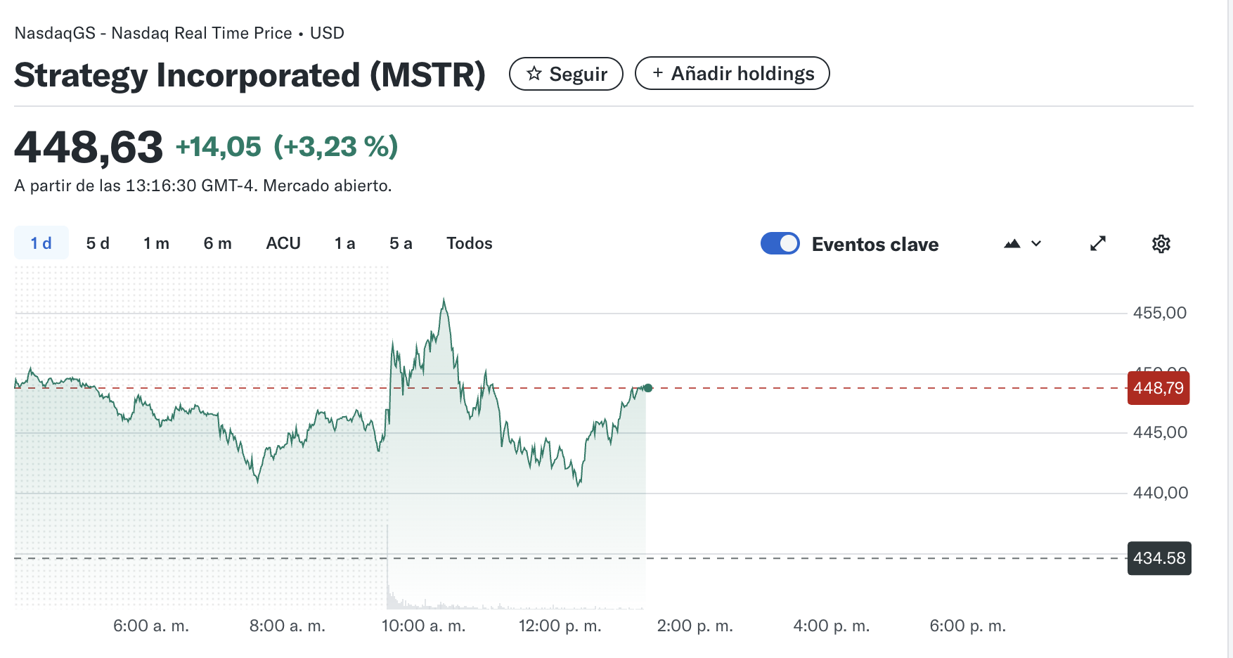 En tanto, las acciones de MicroStrategy (MSTR) han mostrado un rendimiento impresionante en el último año. Las acciones de MSTR registraron una ganancia del 12,90%, alcanzando los 447,66 dólares. Esto ha sido un aumento significativo desde el precio de 86,69 dólares por acción en el último año.