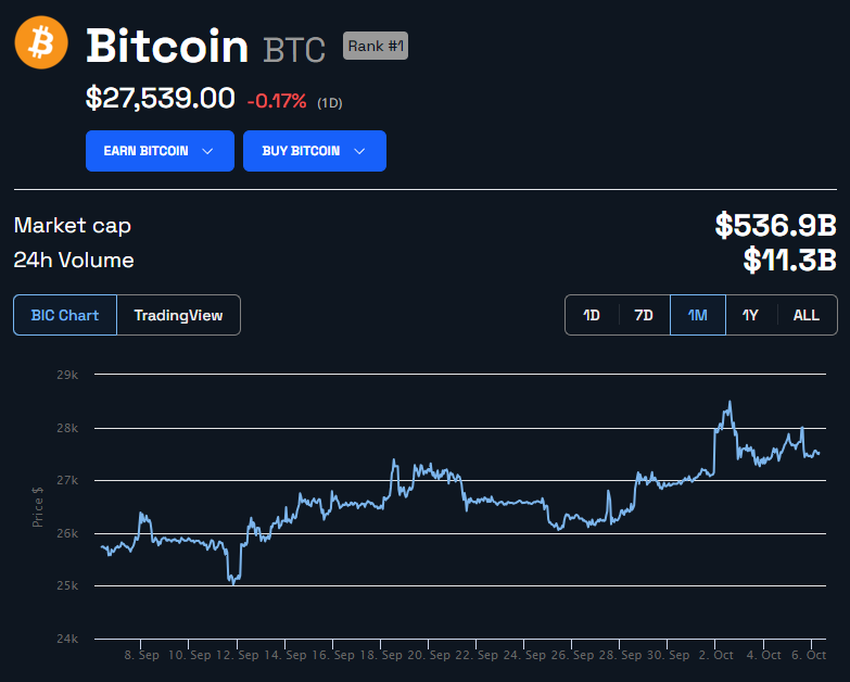 Desde su breve aumento a 28,500 dólares el lunes, Bitcoin ha retrocedido un 3.5% para cotizar a 27,539 dólares en el momento de escribir este artículo. Sin ningún impulso adicional, es probable que el precio de Bitcoin vuelva al soporte en el nivel de los 27,000 dólares.