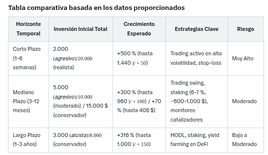 - Agresivo: con 5,000 dólares invertidos y un rally del +300 %, el capital alcanzaría los 20,000 dólares, superando el objetivo.