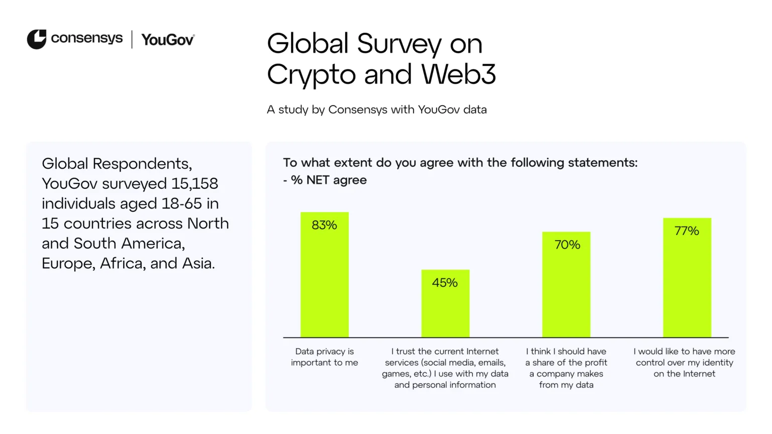 La demanda de un mayor control sobre las identidades en línea y la privacidad de los datos es cada vez más evidente. Una encuesta global realizada por el proveedor de tecnología Ethereum, ConsenSys, encontró que el 79% de los encuestados deseaba tener más control sobre su identidad en línea. La gran mayoría también prioriza la privacidad de los datos.