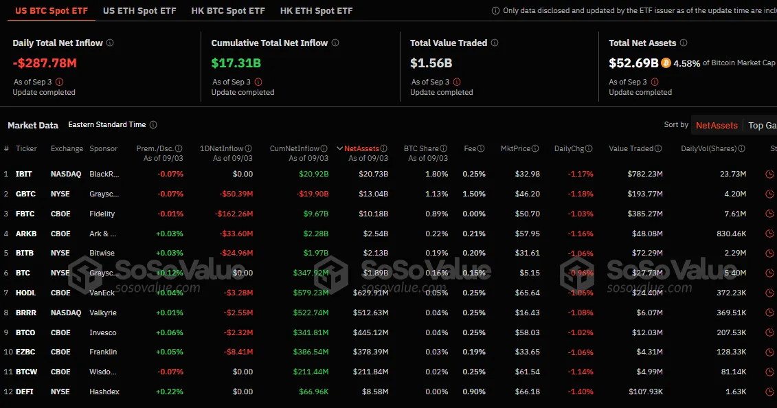 Mientras tanto, los datos de SosoValue muestran que 12 ETF spot de Bitcoin registraron flujos netos negativos. Totalizaron 287.78 millones de dólares el martes, el mayor desde el 1 de mayo. Fidelity lideró las salidas con 162,3 millones de dólares, seguido por Grayscale con 50,4 millones de dólares.