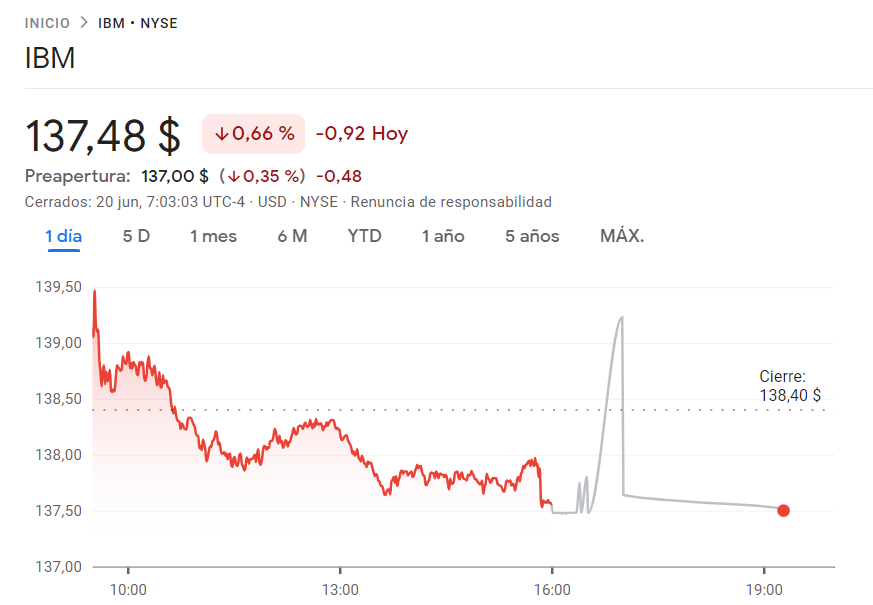 Las acciones de IBM se encuentran cotizando a un valor de 137.48 dólares por acción al momento de escribir el artículo. Las mismas se encuentran cotizando a la baja con una tendencia de -0.92% al 20 de junio.
