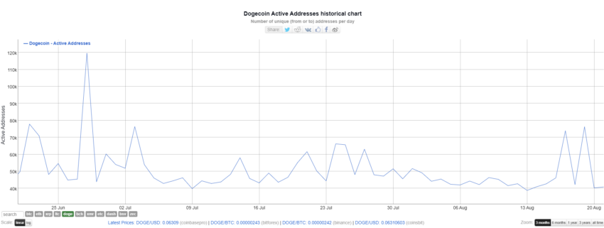 El número de direcciones activas en la red Dogecoin ha subido y bajado durante el último mes. La cifra actualmente se encuentra cerca de un mínimo mensual de 42,000.