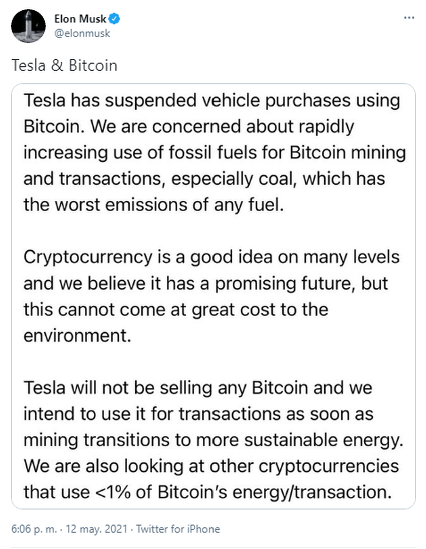 La tormenta mediática comenzó cuando Elon Musk decidió que Tesla que no aceptará Bitcoin como medio de pago debido al alto coste medioambiental derivado por su minado.