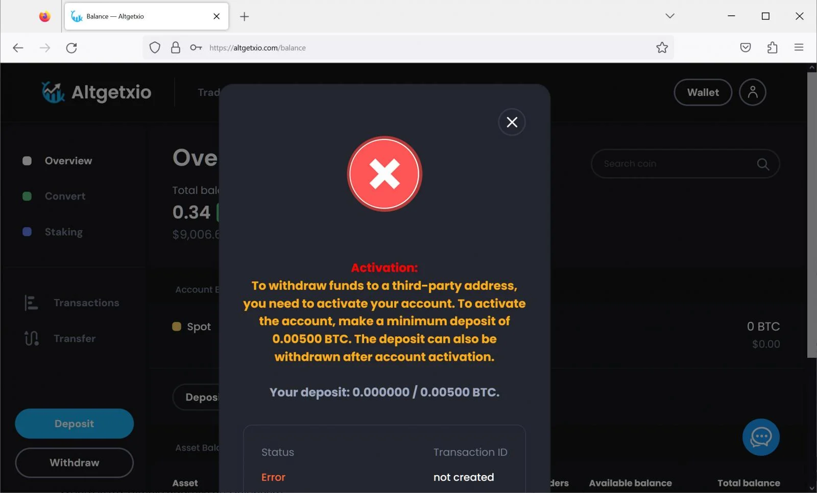 Sin embargo, para retirar el monto, el usuario primero debe depositar 0,005 BTC para “activar” la cuenta.