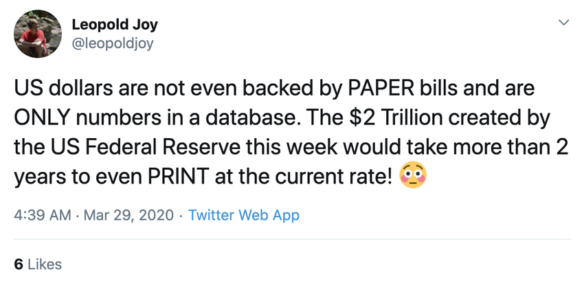 Incluso si estamos siendo generosos y la Fed está imprimiendo más del doble de lo que hizo en 2014, todavía tomaría mucho, mucho tiempo para que el banco central emita esa cantidad de moneda. En efecto, el dinero que se dice que se imprime actualmente ni siquiera se imprime.