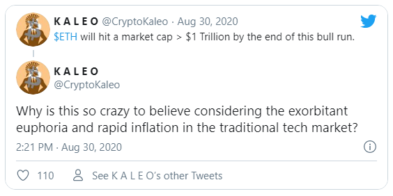 La escuela de pensamiento de Kaleo sugiere que ETH podría escalar alturas de valoración similares a largo plazo. Su predicción de un billón de dólares ETH puede o no haber sido hecha en broma, pero la pregunta es válida.