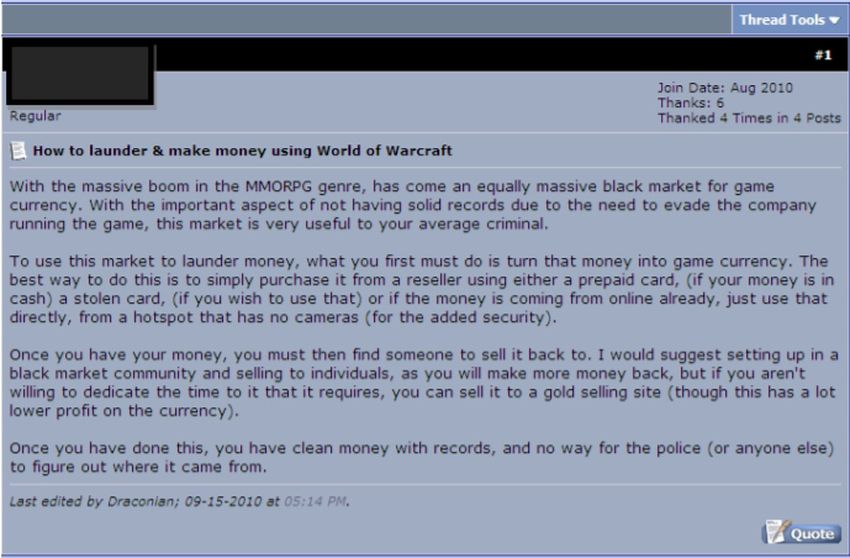 Existen varios foros web en línea donde los usuarios discuten cómo aprovechar los juegos multijugador para lavar dinero robado. En la discusión del tema se incluyó cómo lavar moneda asociada con Clash of Clans y World of Warcraft.