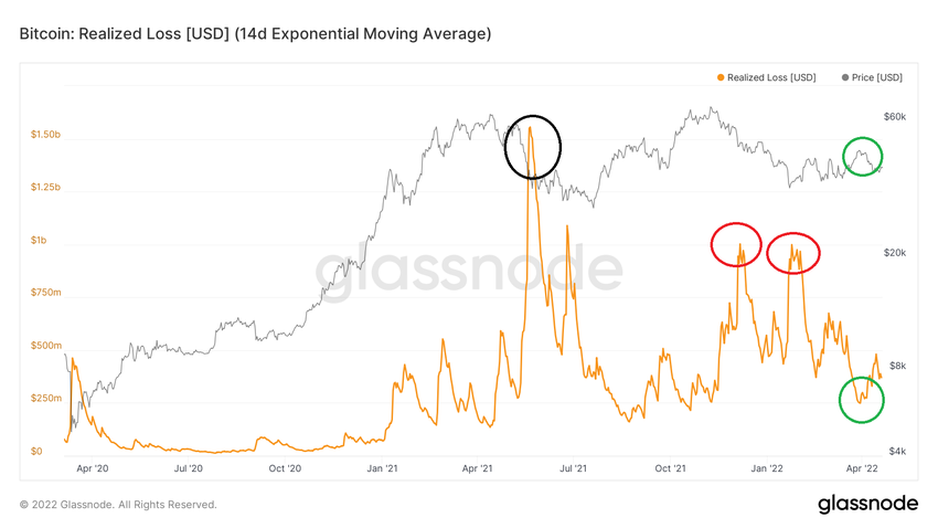 En diciembre de 2021 y el 22 de febrero, las pérdidas realizadas alcanzaron un máximo cercano a los 1,05 mil millones de dólares (círculos rojos). Esto probablemente fue causado como resultado de los compradores más altos de todos los tiempos, que compraron a precios superiores a 60,000 dólares en noviembre.