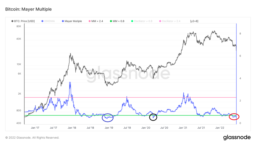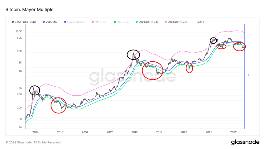 El Mayer Multiple (MM) es un oscilador que se calcula tomando la relación entre el precio de BTC y su promedio móvil (MA) de 200 días. El oscilador 0.8 (verde) y 2.4 (púrpura) se trazan posteriormente para determinar los máximos y mínimos del mercado.
