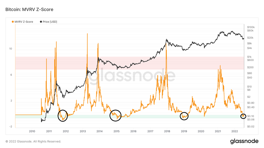 Una observación interesante es que incluso cuando se alcanzó el fondo poco después del primer cruce, como fue el caso en 2015, pasó mucho tiempo hasta que MVRV regresó a territorio positivo.