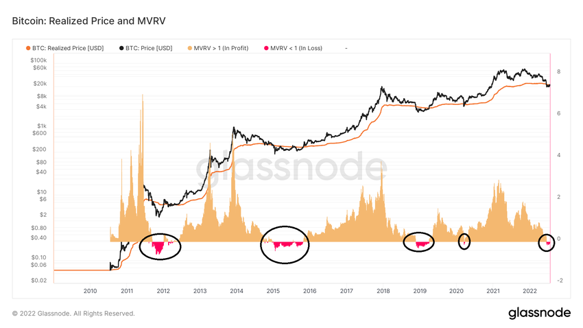 Los días en los que MVRV ha registrado pérdidas se pueden visualizar mejor utilizando el workbench. Como se puede ver en los círculos negros, los momentos en los que el precio de BTC cae por debajo del precio realizado (línea naranja) están asociados con lecturas negativas en MVRV.