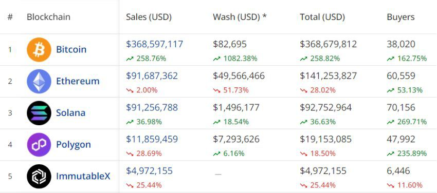 El volumen de operaciones NFT basado en Ethereum durante el mismo período alcanzó los 93,45 millones de dólares. y para Solana – 90,74 millones de dólares.