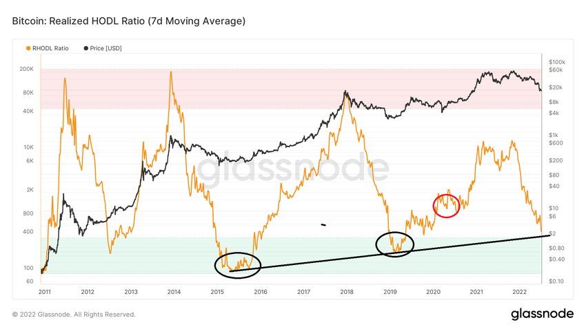 Una posibilidad es que los fondos de RHODL parezcan haber estado siguiendo una línea de soporte ascendente, ya que el fondo de 2019 fue más alto que el de 2015. Esto significa que los holders a largo plazo tienen cada vez menos suministro durante los mínimos a medida que BTC madura.