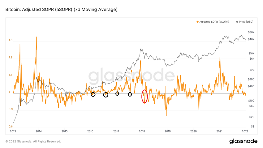 El SOPR ajustado (aSOPR) es ligeramente diferente, ya que no tiene en cuenta las transacciones que tienen una vida útil inferior a una hora.
