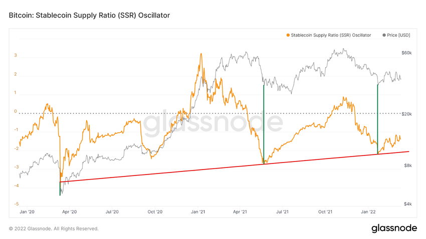 En el gráfico del oscilador SSR de Glassnode, sí vemos una línea de soporte ascendente que se remonta al colapso de la pandemia de COVID-19 en marzo de 2020. Cada toque de esta línea de soporte se correlaciona con un fondo en el precio de Bitcoin.