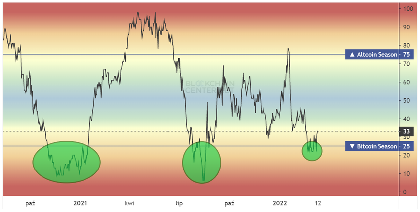 Las dos ocasiones anteriores (resaltadas) cuando el gráfico cayó por debajo de 25 ocurrieron entre noviembre de 2020-enero de 2021 y julio-agosto de 2021. Estos se correlacionan con períodos en los que TOTAL2 estaba experimentando una corrección (si BTC estaba cayendo) o una tendencia lateral (si BTC estaba aumentando). Sin embargo, en ambos casos, un retorno a valores más altos por encima de 25 fue una señal de una gran altseason.