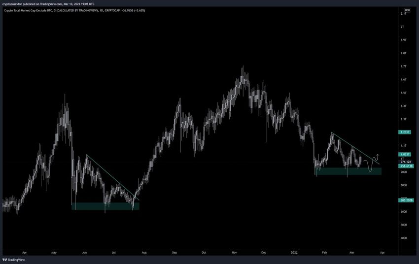El trader de criptomonedas @CryptoPoseidonn tuiteó un gráfico de TOTAL2, lo que indica una posible ruptura importante. Compara la corrección del verano de 2021 con la situación actual. El trader espera que una ruptura de la línea de resistencia a la baja, seguida de su validación como soporte, conduzca a una nueva altseason.