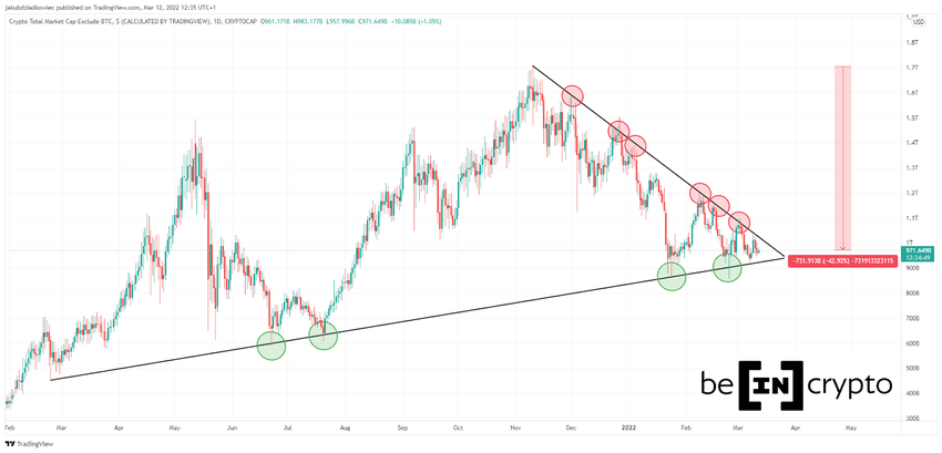 En el análisis on-chain de hoy, BeInCrypto compara el Stablecoin Supply Ratio (SSR) y su oscilador con el gráfico de capitalización de mercado de altcoins. El objetivo es tratar de determinar si esperar la llegada de la primera altseason en 2022.