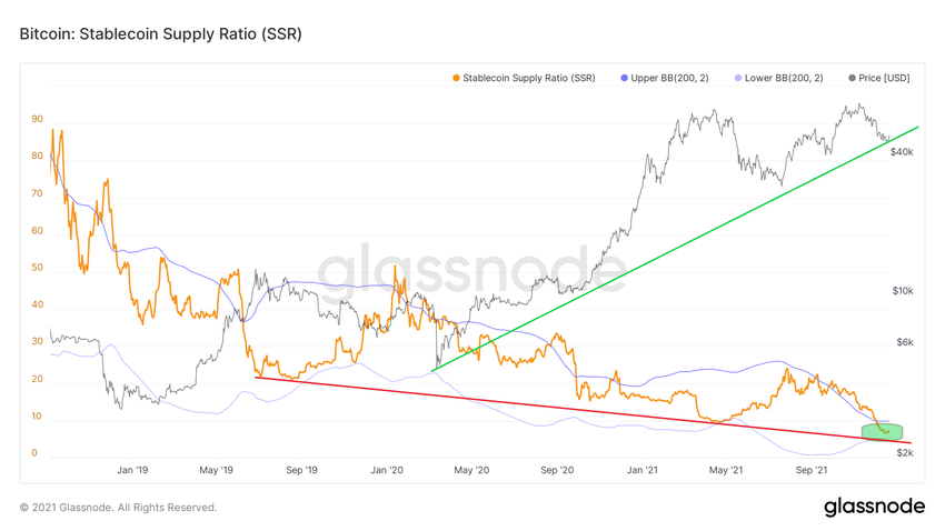 Además, notamos dos líneas de tendencia (no ideales) en el gráfico. La línea de tendencia alcista verde se relaciona con el precio de BTC, que ha estado subiendo desde el mínimo de marzo de 2020. La línea de tendencia bajista roja se relaciona con el SSR y ha estado vigente desde julio de 2019. Tenga en cuenta que su disminución indica un aumento en el poder adquisitivo de la stablecoin. Si se mantiene la correlación positiva entre el creciente poder adquisitivo de la stablecoin y el precio de BTC, podemos esperar que las dos tendencias continúen.