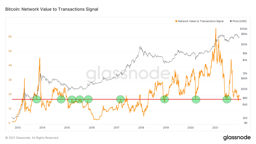 El primero es NVT Signal, que es un indicador on-chain igualmente antiguo y eficaz. Ha demostrado ser particularmente eficaz cuando ha alcanzado el territorio de “sobreventa” que históricamente se ha correlacionado con los mínimos macro de Bitcoin.