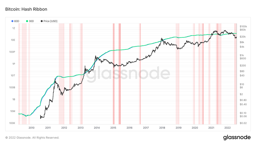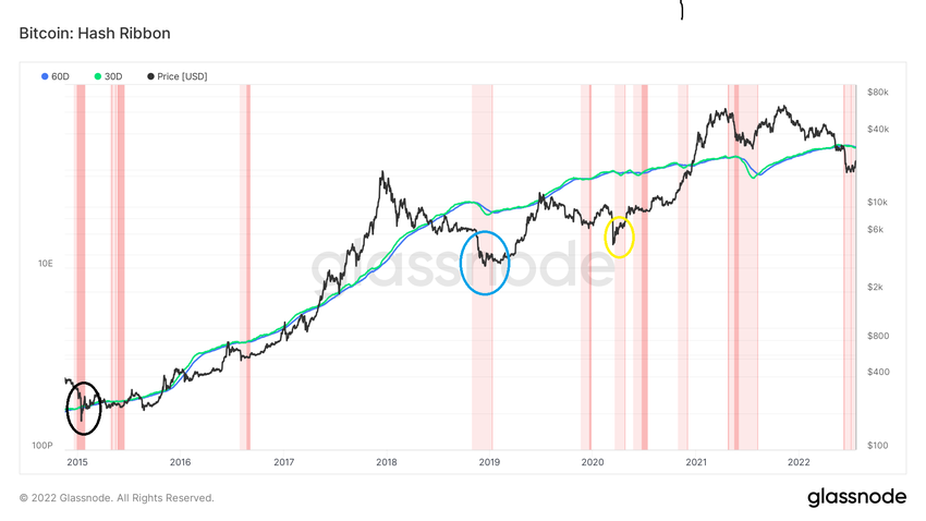 El indicador hash ribbon utiliza el hashrate para determinar si los mineros han capitulado. La capitulación de los mineros ocurre cuando las recompensas mineras son más bajas que los costos.