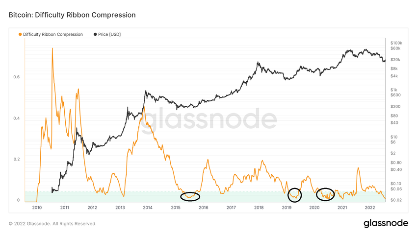 Como resultado de estas lecturas, el indicador difficulty ribbon compression sugiere que BTC está cerca de tocar fondo.