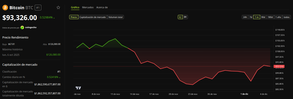 Cruzó debajo de 40 en octubre y actualmente se encuentra en el rango de 20–30, niveles típicos de mercados bajistas. Ni siquiera el repunte hacia los 93,000 dólares ha logrado alterar la tendencia general.