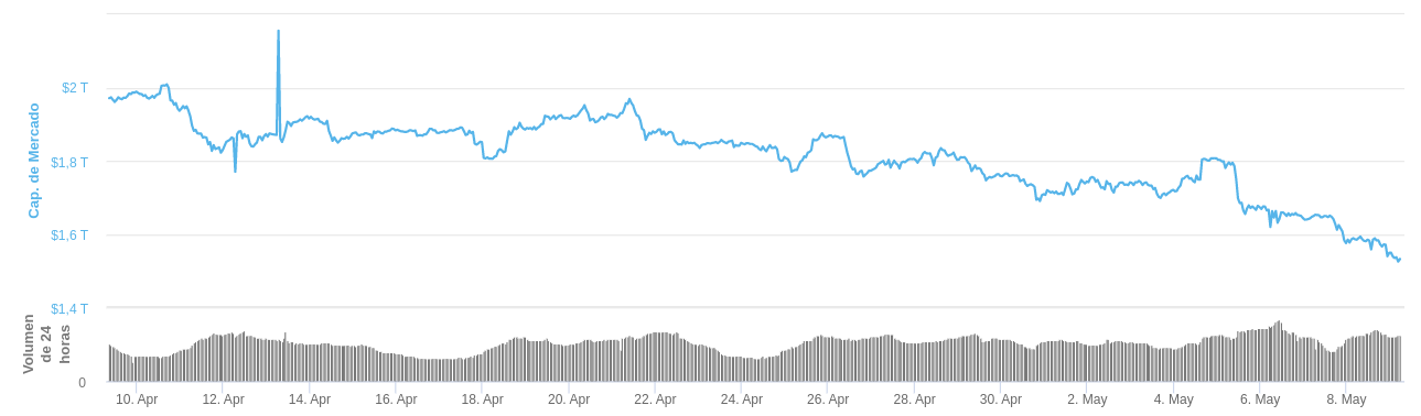 En un marco más amplio, el mercado cripto continúa su descenso. El pasado mes de abril registró un total de 2,1 billones de dólares.