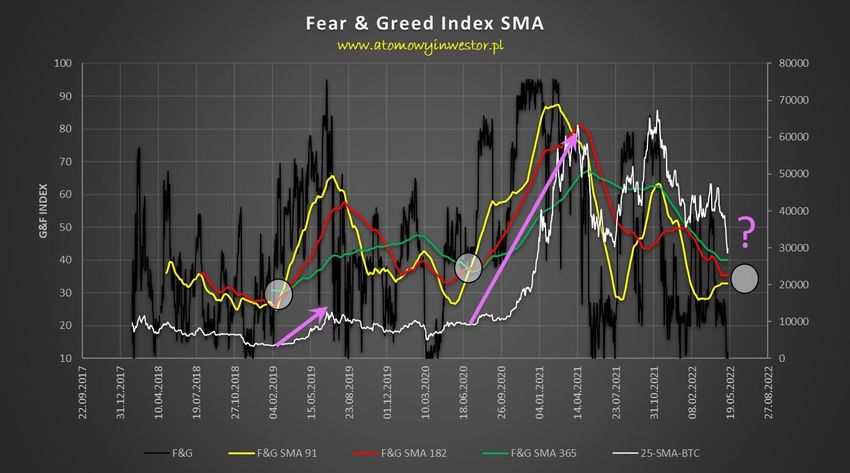 Además, un análisis histórico de las medias móviles del Índice de Miedo y Codicia muestra que incluso el final de las caídas no significó el comienzo de las tendencias alcistas. Resulta que siempre transcurrieron varios meses desde los mínimos extremos del índice hasta el inicio del mercado alcista de criptomonedas. Esta vez fue generalmente un período de larga consolidación y una tendencia lateral.