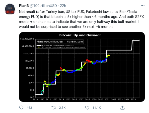 Contrario al sentimiento bajista, PlanB, analista de criptomonedas, publicó ayer un gráfico actualizado de su modelo de flujo de acciones. Según él, el mercado alcista ha alcanzado la mitad de su carrera y, después de un período de consolidación, verá otra subida de un 5x.