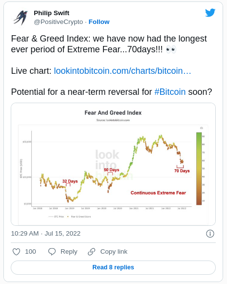 Mientras Bitcoin está tratando de generar el fondo del bear market actual, el Índice de Miedo y Codicia permanece constantemente en un miedo extremo. El Índice ha estado en un rango de sentimiento extremadamente negativo durante un récord de 72 días.