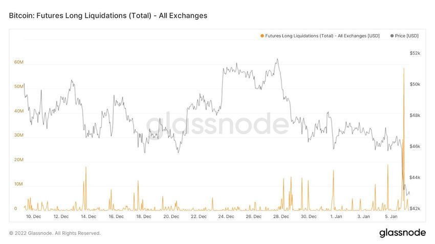 Solo en el mercado de futuros de BTC, las liquidaciones totalizaron 318 millones de dólares. De éstos, hasta el 88% eran posiciones largas. La razón más probable de la caída más profunda fue la liquidación en cascada de posiciones largas después de que BTC perdiera soporte cerca de 45,500 dólares. Desde ese evento, Bitcoin ha tocado fondo en 42,500 dólares en solo cuatro horas.