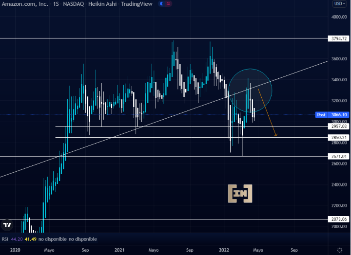 El primer objetivo alcanzar en el precio de Amazon será el área de soporte de los 2,850 dólares y como objetivo final los 2,073 dólares.