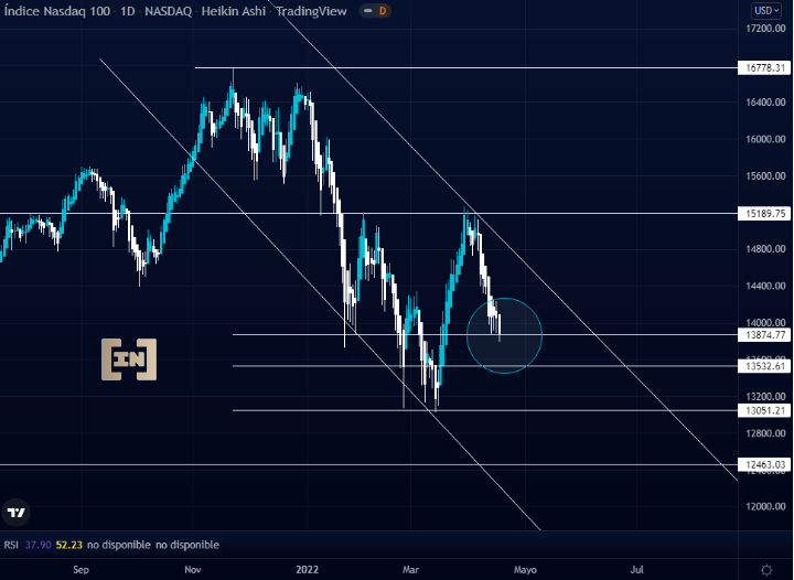 La zona entre los 13874 puntos y los 14048 puntos en tiempo diario se consideraba de confluencia o indecisión en el mercado del sector tecnológico.