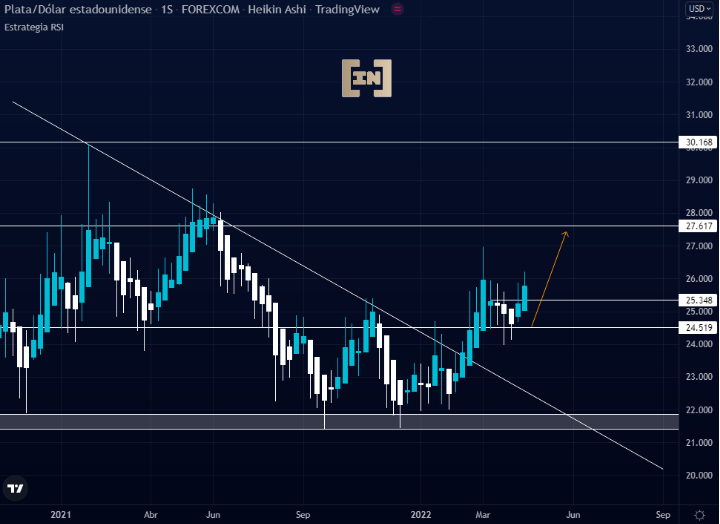 En tiempo semanal el precio de la plata ha perforado un área importante de resistencia los 25.3 dólares y con la formación de velas Heikin Ashi tal parece indicar que el siguiente objetivo alcanzar será los 27.6 dólares.